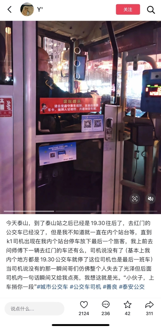 事后,這位來泰山旅游的外地游客通過個人抖音發(fā)布了對律發(fā)彬師傅的稱贊,滿含感激之情,引發(fā)眾多網(wǎng)友關(guān)注點贊。律發(fā)彬師傅的善舉,生動詮釋了泰安公交“想乘客所想,急乘客所急” 的服務(wù)理念。一直以來,泰安公交始終踐行“全心全意為人民服務(wù)”的宗旨,今后將持續(xù)為泰城市民和來泰山旅游的游客,提供更加優(yōu)質(zhì)、貼心的公交出行服務(wù),讓每一位踏上泰安土地的人,都能真切感受到這座城市的溫暖與善意。