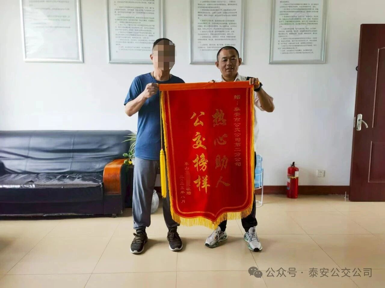94日下午,泰安公交第二分公司辦公室迎來(lái)了一位特殊的訪(fǎng)客——市民方先生。他手捧一面鮮艷的錦旗,專(zhuān)程前來(lái)尋找并感謝曾在危難之際向他伸出援手的兩位公交人:分公司保衛(wèi)值班人員李潛和26路駕駛員李斌。