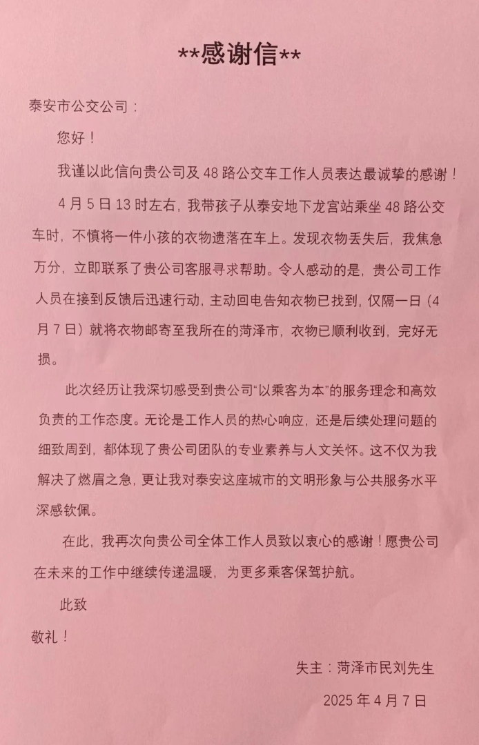 4月10日,泰安公交第三分公司收到了一份裝有感謝信的郵政快遞。事情是這樣的,菏澤的劉先生來(lái)泰安旅游乘坐公交車時(shí),孩子不慎將衣服丟失,泰安公交人及時(shí)幫助找回,并將衣服郵寄到菏澤歸還。劉先生收到孩子的衣服后,非常感動(dòng),專門寫(xiě)了一封感謝信,郵寄到泰安公交,對(duì)駕駛員及工作人員表示由衷的感謝。