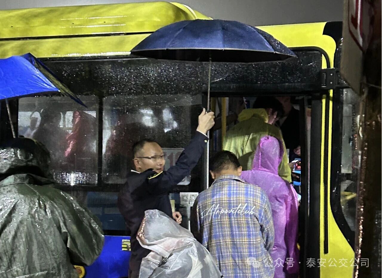 同樣是104日,夜幕比往常來得更早一些。傍晚時(shí)分,雨絲突然密集起來,像珠簾般砸向地面,桃花峪公交樞紐站的路面很快積起淺淺的水洼。下山的游客們抱著行李、牽著孩子,站在站臺(tái)下有些慌亂,直到一個(gè)身著深藍(lán)色制服的身影撐著傘走了過來——他是泰安公交泰山百合志愿者,也是這個(gè)雨夜最溫暖的“守護(hù)者”。