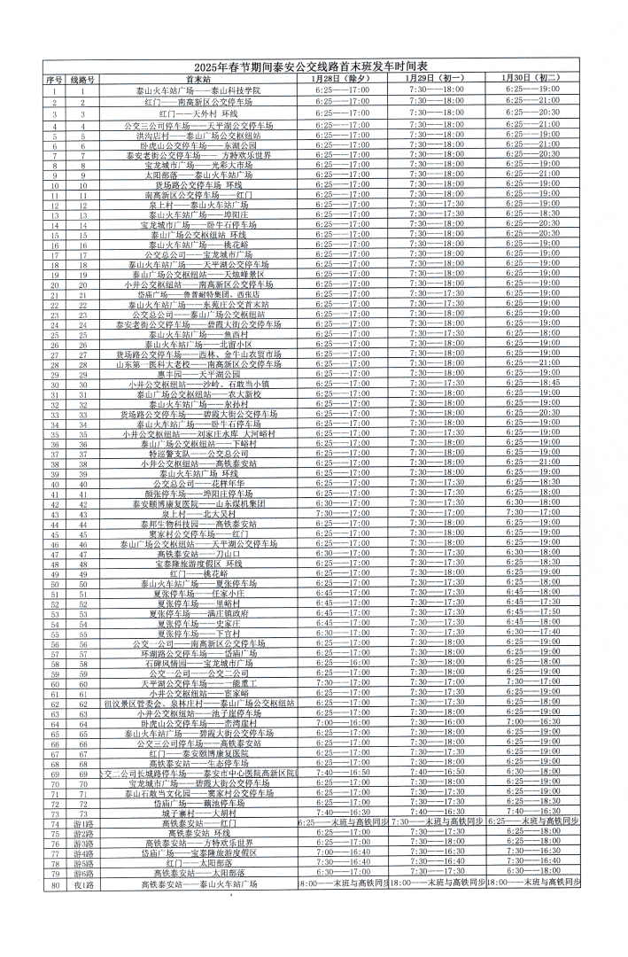 為切實(shí)保障好春節(jié)期間市民出行,泰安市公共交通有限公司結(jié)合市民節(jié)日出行規(guī)律和變化,統(tǒng)籌考慮安排公交線路首末班發(fā)車時(shí)間,1月28日、29日(除夕、初一)將對(duì)所屬營(yíng)運(yùn)線路發(fā)車間隔、首末班時(shí)間等作出調(diào)整(具體情況見(jiàn)附表)。